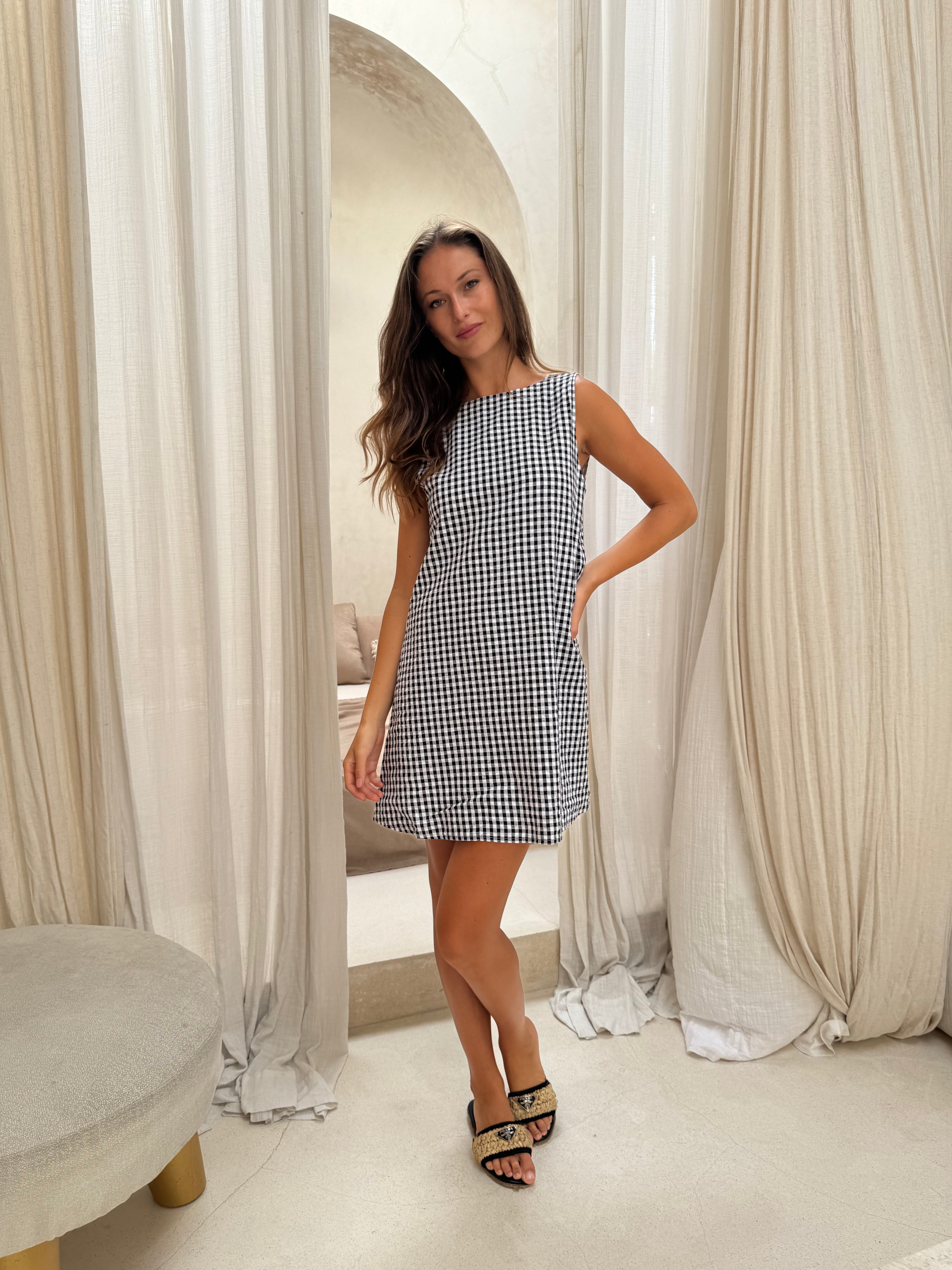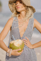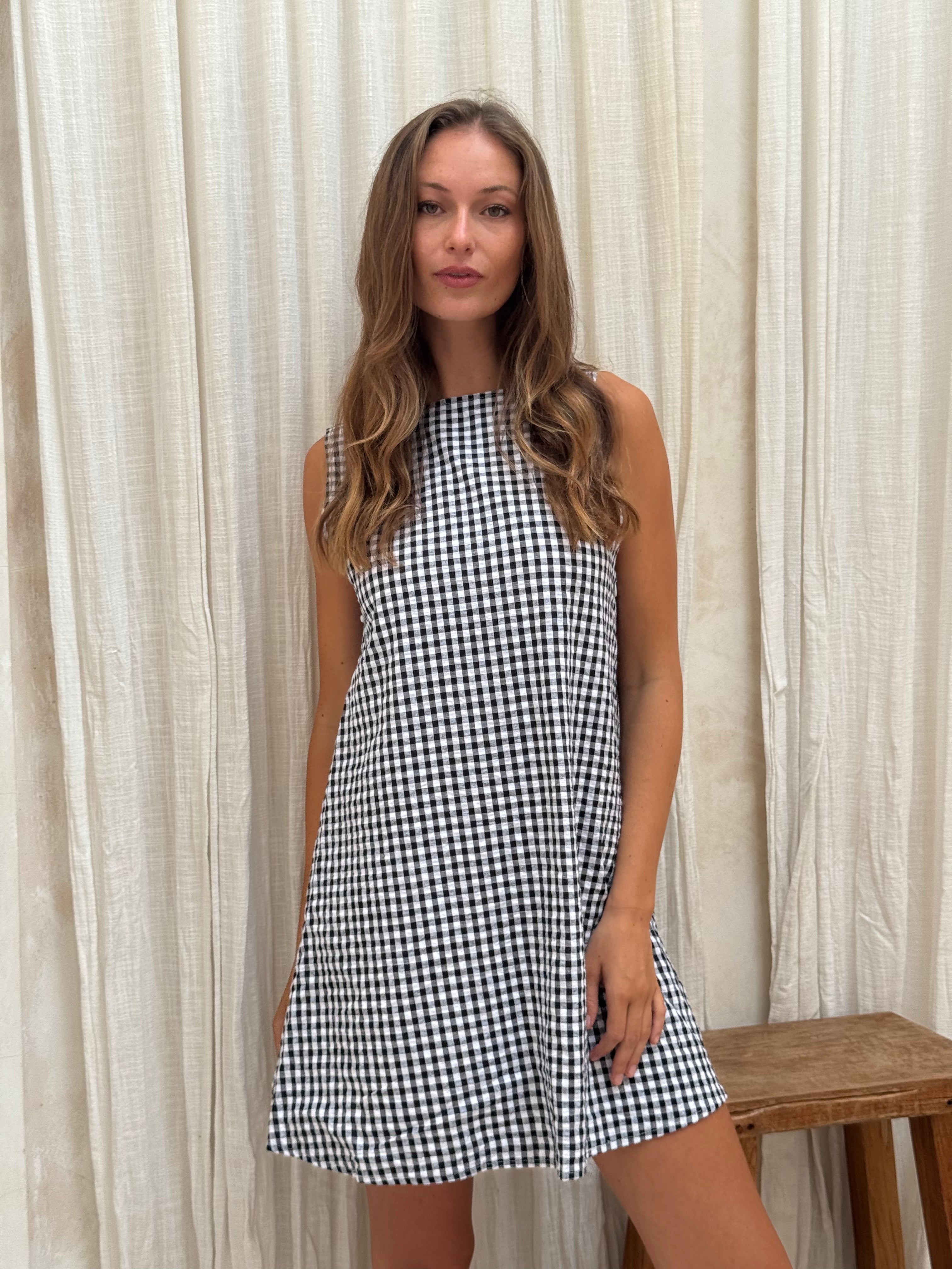 This versatile dress can be styled with a V-neck or high-neck neckline, giving you the freedom to tailor your look. The bold black gingham print adds a fun, feminine touch, perfect for brunches, summer parties, 4th of July celebrations, baby showers, or casual day-to-night looks.