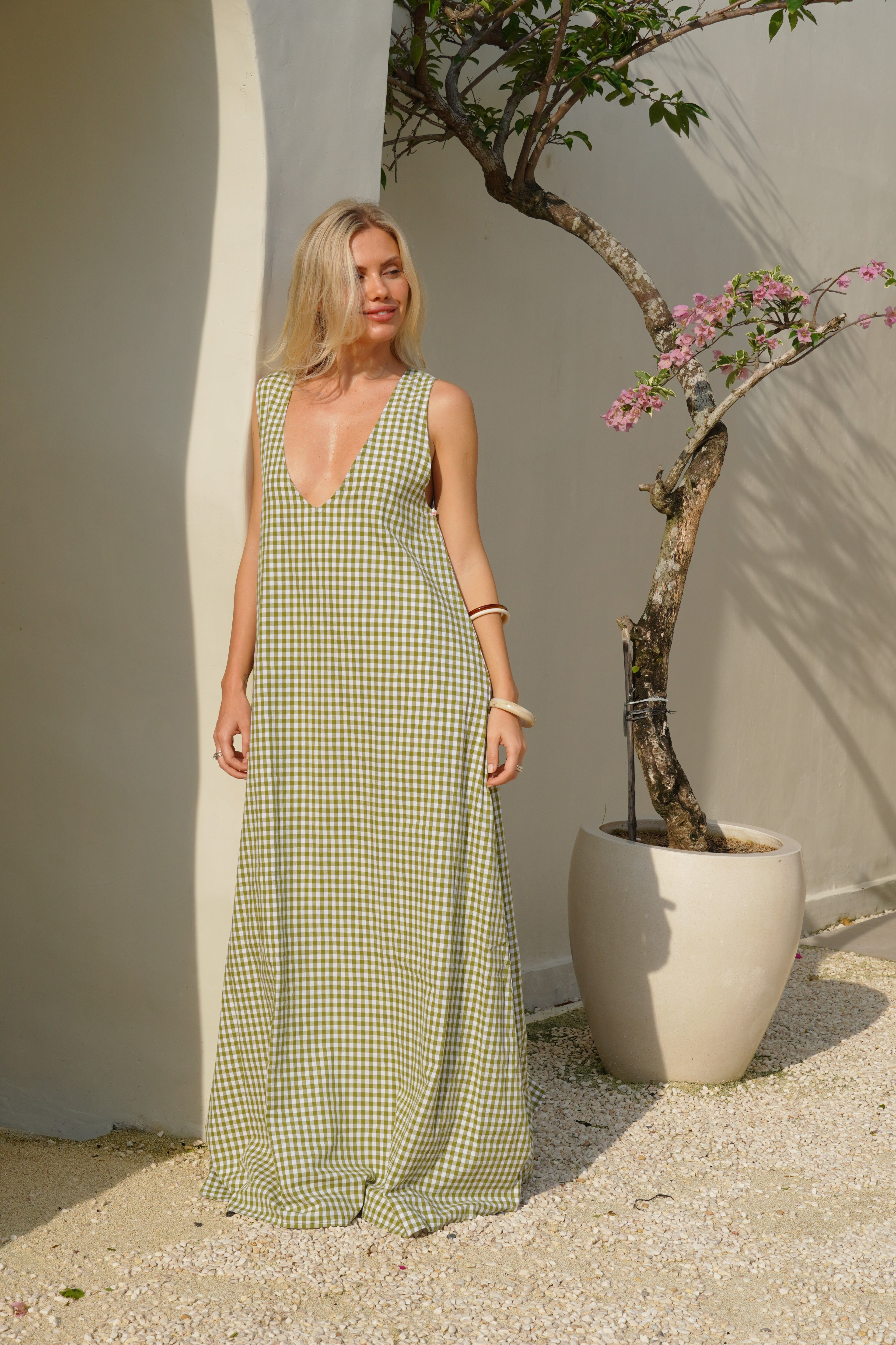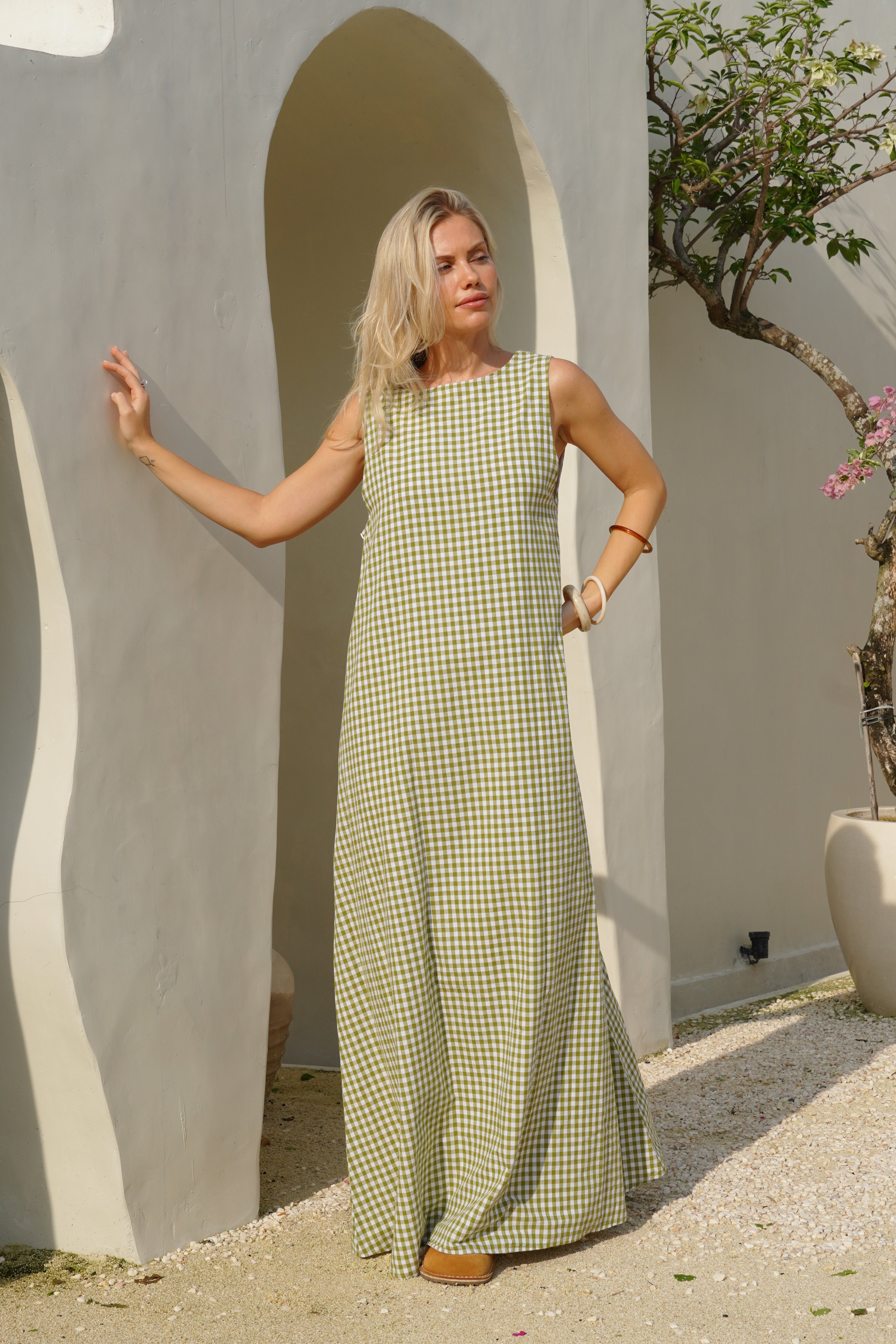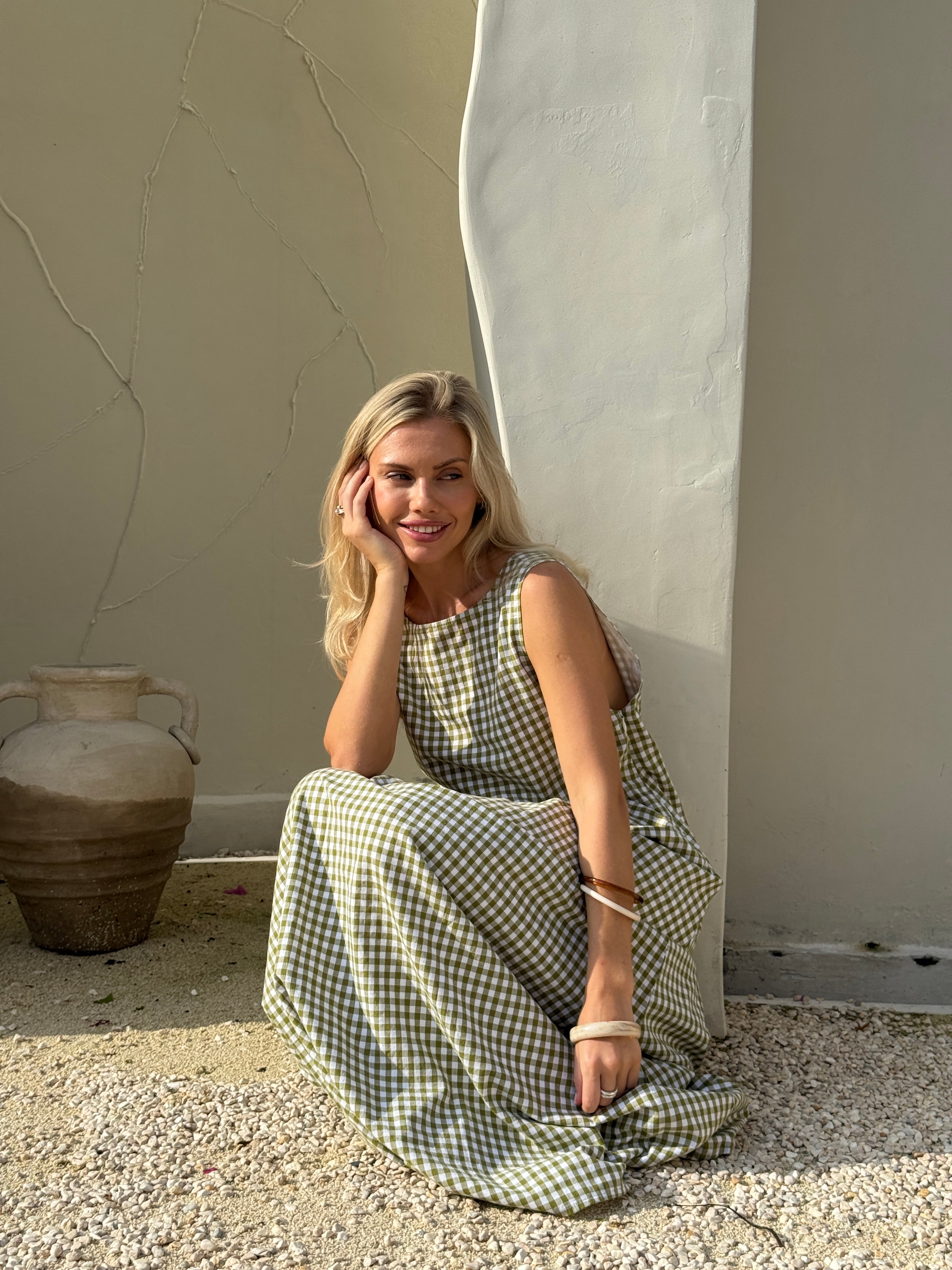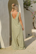 Our Couper exclusive Gili Dress in Green Gingham! This reversible maxi dress is cleverly lined so it can be worn in both casual and more formal settings. Enjoy the versatility of this dress, with the option to wear it as a plunging v-neck or high neck dress.