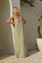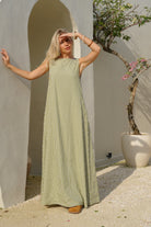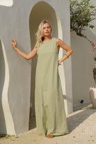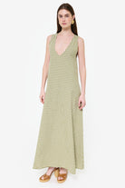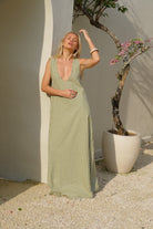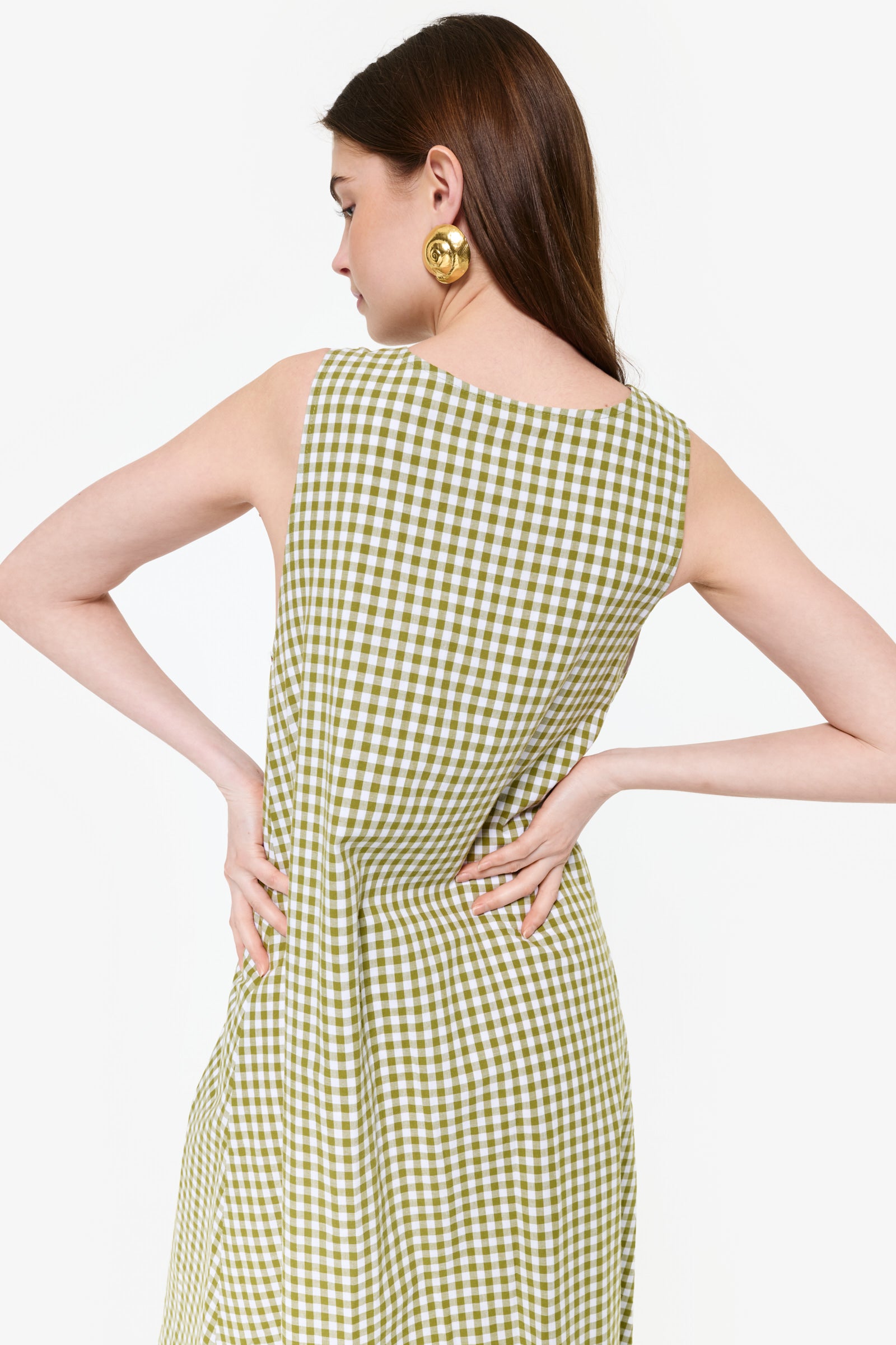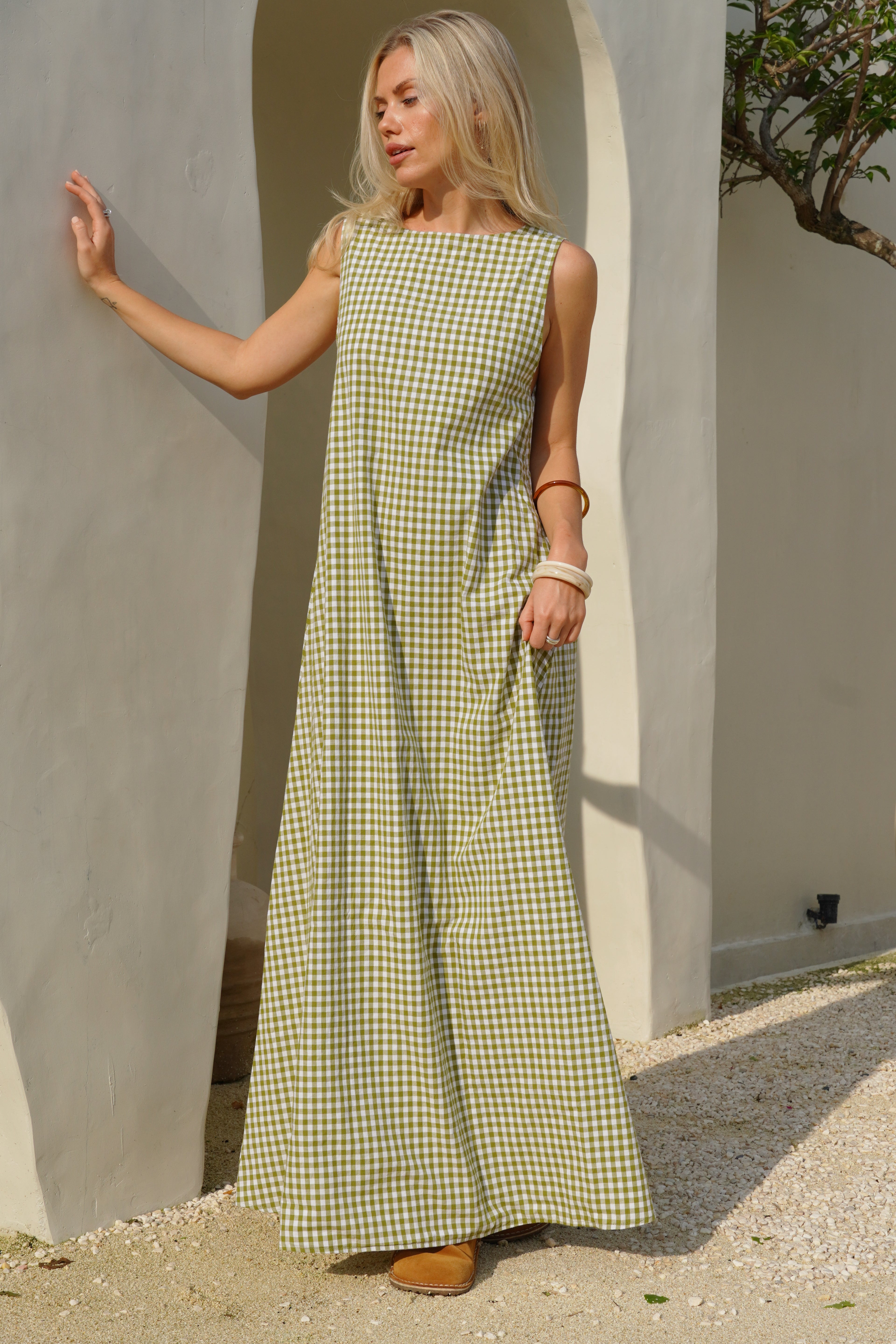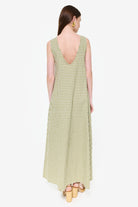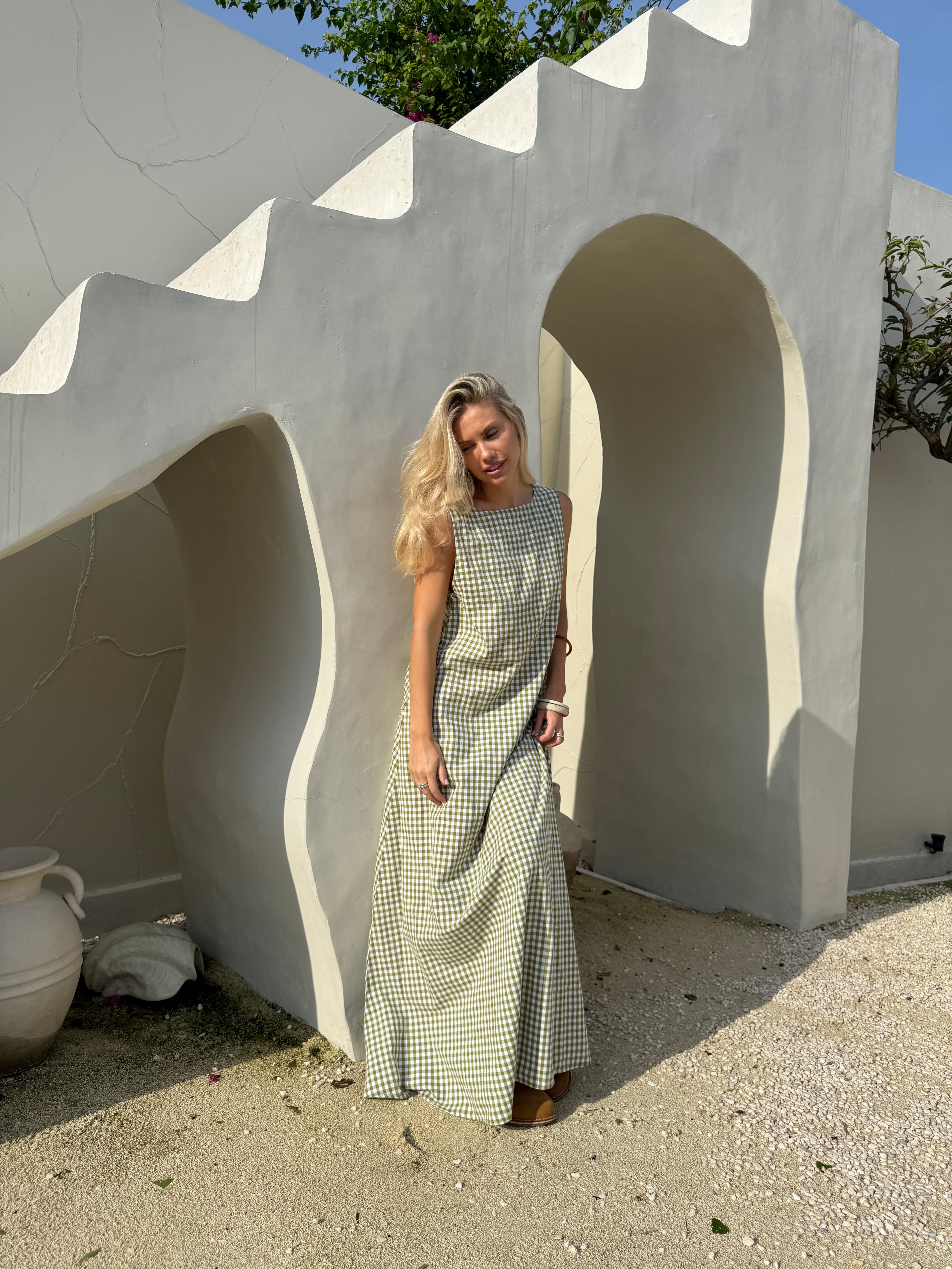 Our Couper exclusive Gili Dress in Green Gingham! This reversible maxi dress is cleverly lined so it can be worn in both casual and more formal settings. Enjoy the versatility of this dress, with the option to wear it as a plunging v-neck or high neck dress.