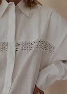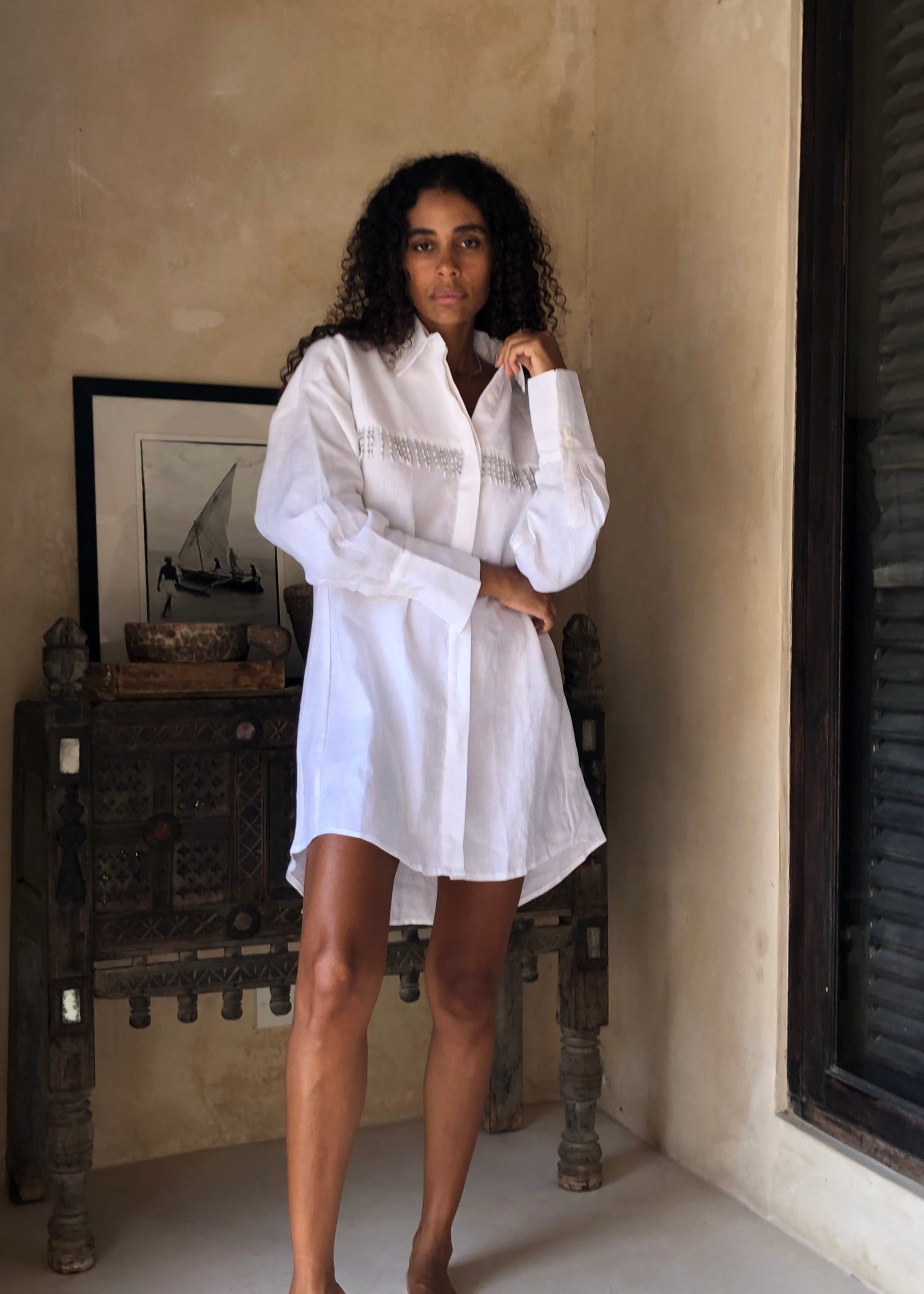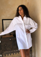 The White Ulu Dress takes our best-selling button-up top and turns it into an effortless statement piece. Made from breathable 100% linen with a relaxed, oversized silhouette, this white button-up dress is styled with dropped shoulders and playful hand-beaded fringe - each beadwork detail crafted by hand in our Bali studio.