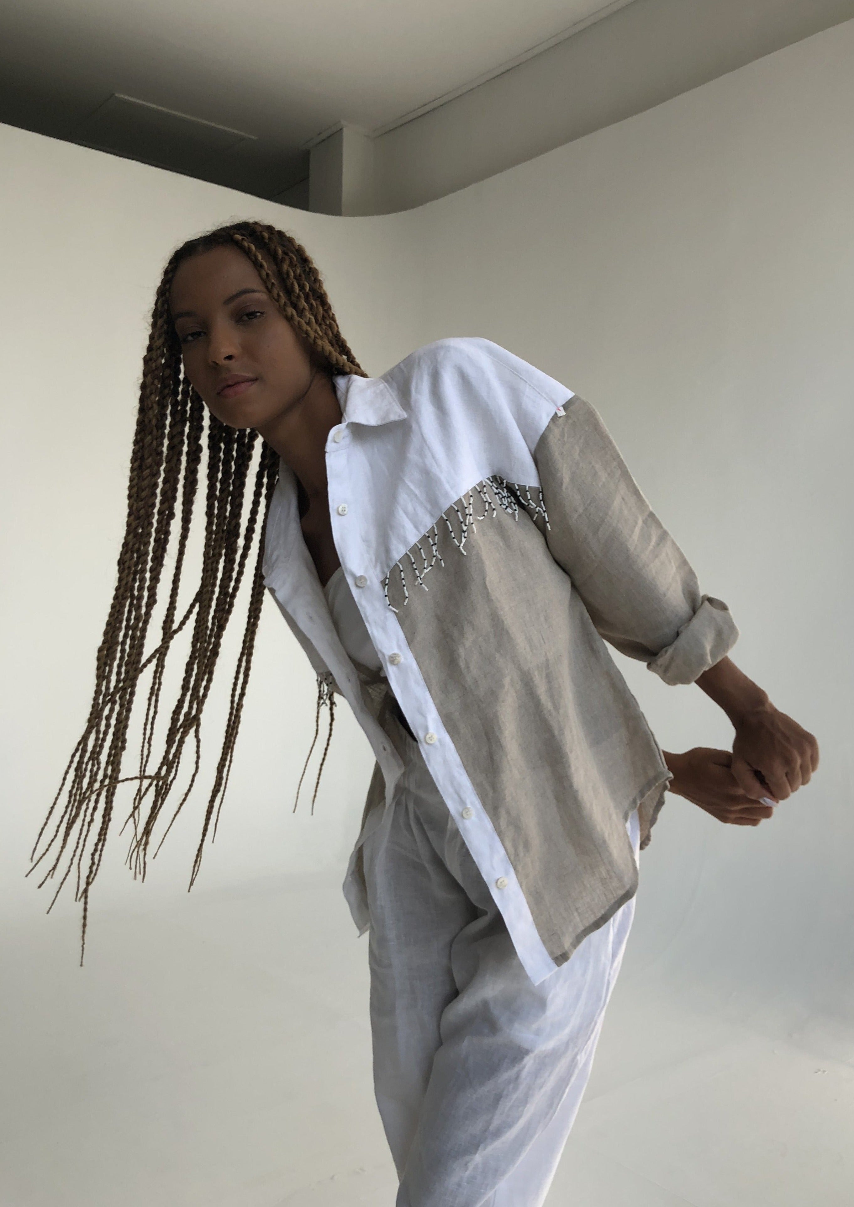 Introducing our color block Ulu in soft natural and white linen. The “Oversized Ulu” – a classic linen button up designed with dropped shoulders for a relaxed fit. This western inspired shirt takes up to four hours to bead by hand in our Bali studio.